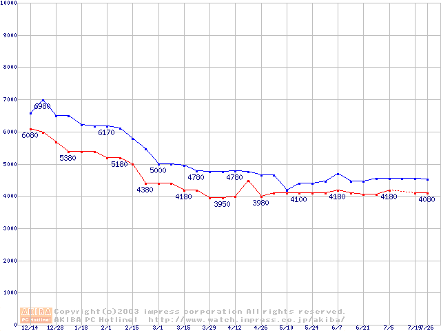 | [↓次グラフ]: | Deskstar 180GXP (7200rpm,8MB,UltraATA/100,FDB)の最安値推移 |