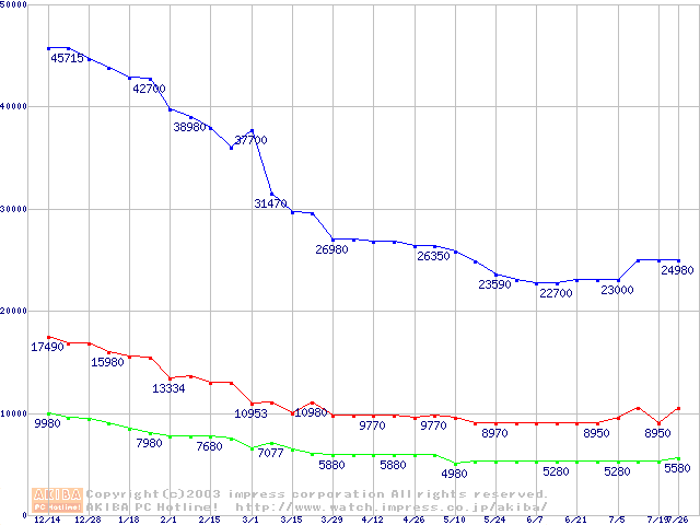 | [↑前グラフ]: | PC2100(DDR266) DDR SDRAM DIMM(CL 2.0)の最安値推移 |