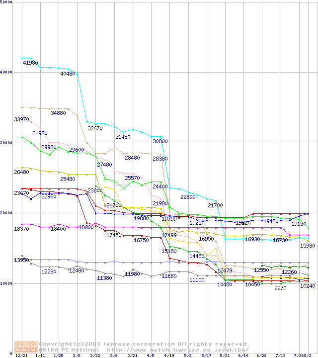 CPU主要製品(最安値2万円~3万円未満)の最安値推移