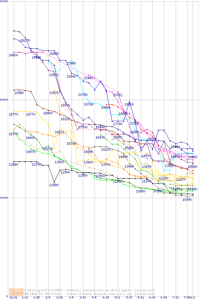 HDD主要製品(最安値1万5千円~2万円未満)の最安値推移