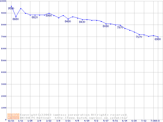 | [↓次グラフ]: | HDD 80GB~100GB未満(5400rpmクラス)の最安値推移 |