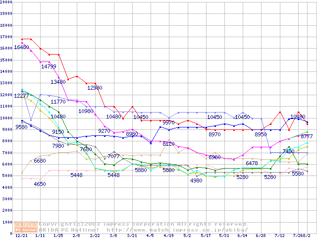 メモリ主要製品(最安値1万円以上)の最安値推移