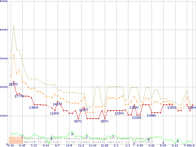 PC133 SDRAM DIMM CasLatency=3 ECC対応 Registeredタイプの最安値推移
