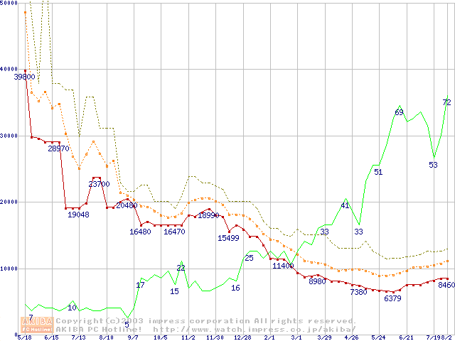 PC3200(DDR400) DDR SDRAM DIMMの最安値推移