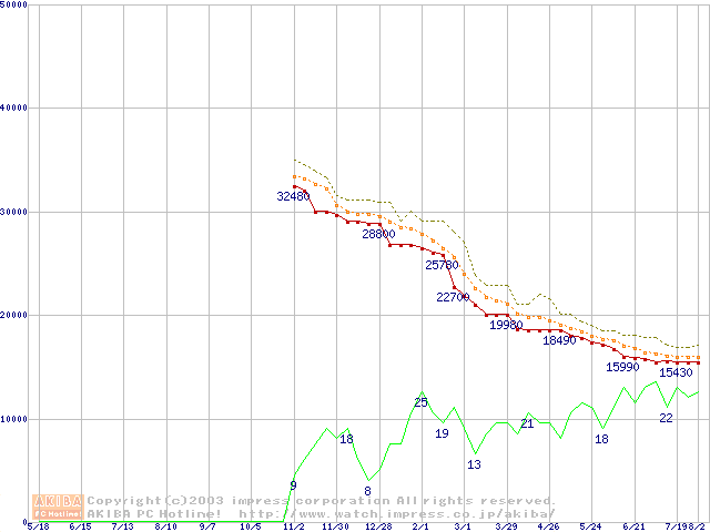 HDD主要製品(最安値1万5千円~2万円未満)の最安値推移