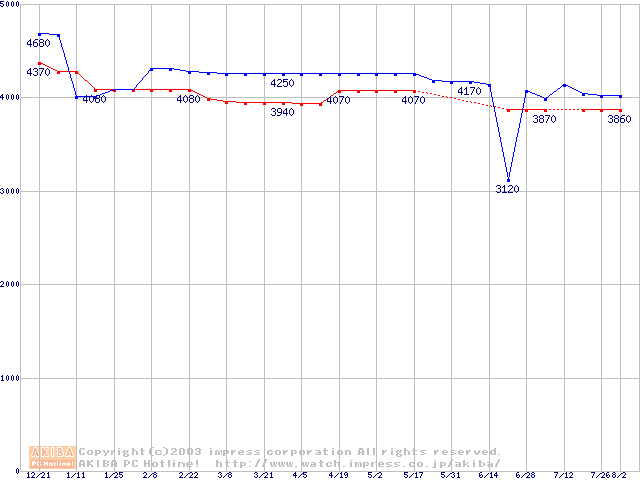 | [↑前グラフ]: | Socket A (PGA,FSB 200MHz,L2 256KB,Thunderbird)の最安値推移 |
