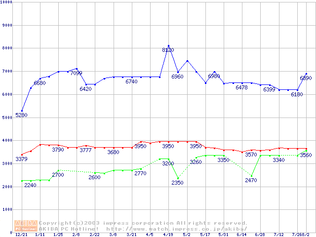 | [↑前グラフ]: | PC133 SDRAM DIMM CasLatency=3の最安値推移 |