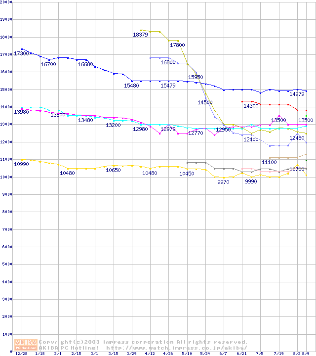 2.5インチHDD主要製品(最安値1万5千円~2万円未満)の最安値推移