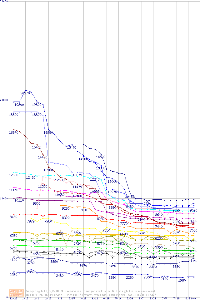 CPU主要製品(最安値1万円~2万円未満)の最安値推移