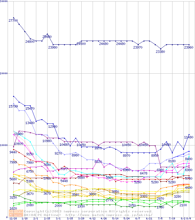 メモリ主要製品(最安値1万円以上)の最安値推移