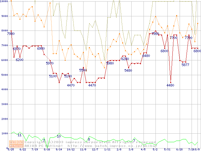 PC133 SDRAM DIMM CasLatency=3 ECC対応の最安値推移
