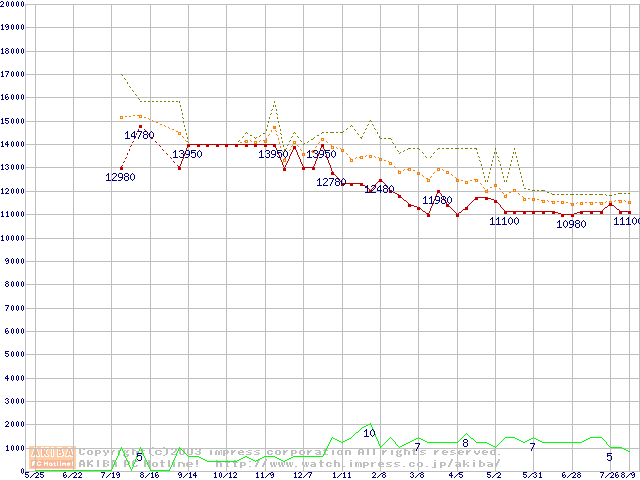 Socket 370 (FC-PGA,FSB 133MHz,L2 256KB,Coppermine)の最安値推移