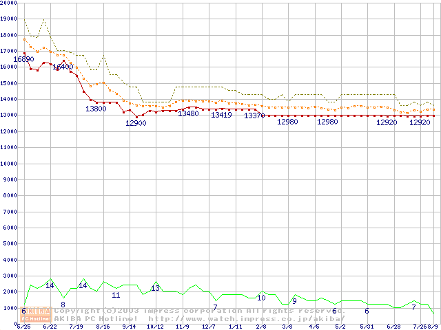 Socket 370 (FC-PGA2,FSB 133MHz,L2 256KB,Tualatin)の最安値推移