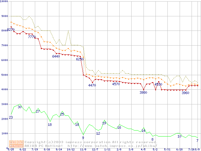 Socket 370 (FC-PGA2,FSB 100MHz,L2 256KB,Tualatin)の最安値推移