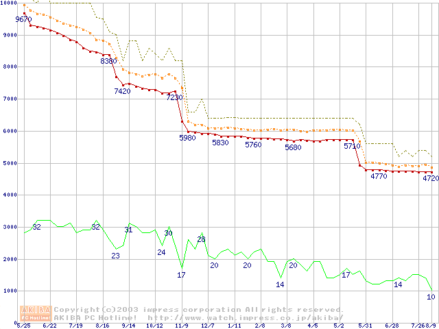 Socket 370 (FC-PGA2,FSB 100MHz,L2 256KB,Tualatin)の最安値推移