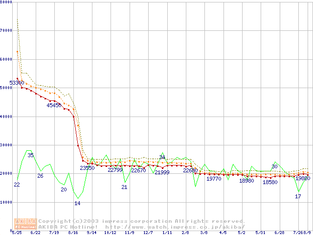 Socket 478 (micro-PGA,FSB 533MHz,L2 512KB,Northwood)の最安値推移