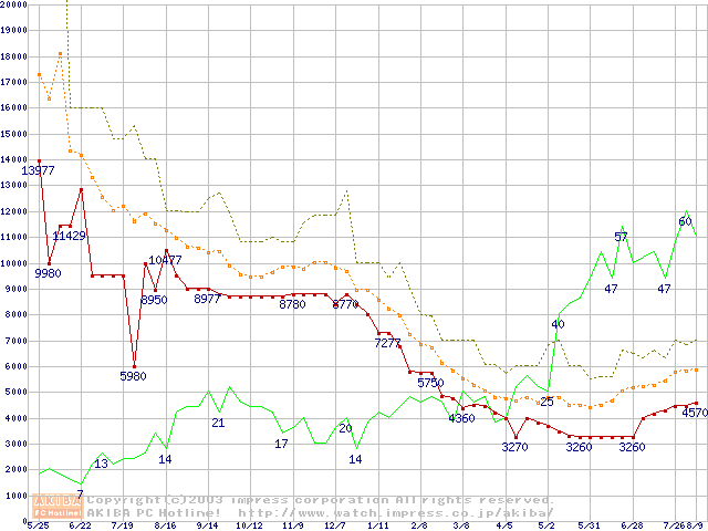 PC3200(DDR400) DDR SDRAM DIMMの最安値推移