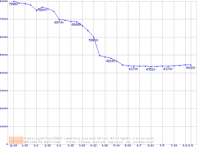 | [↑前グラフ]: | Socket 478 (micro-PGA,FSB 800MHz,L2 512KB,Hyper-Threading,Northwood)の最安値推移 |