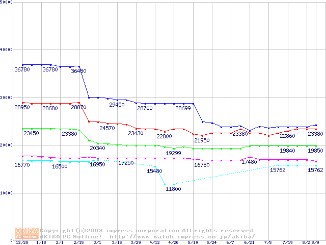 | [↑前グラフ]: | Socket 478 (micro-PGA,FSB 533MHz,L2 512KB,Northwood)の最安値推移 |