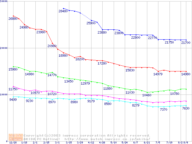 | [↓次グラフ]: | DiamondMax Plus 8 (7200rpm,2MB,UltraATA/133,FDB)の最安値推移 |