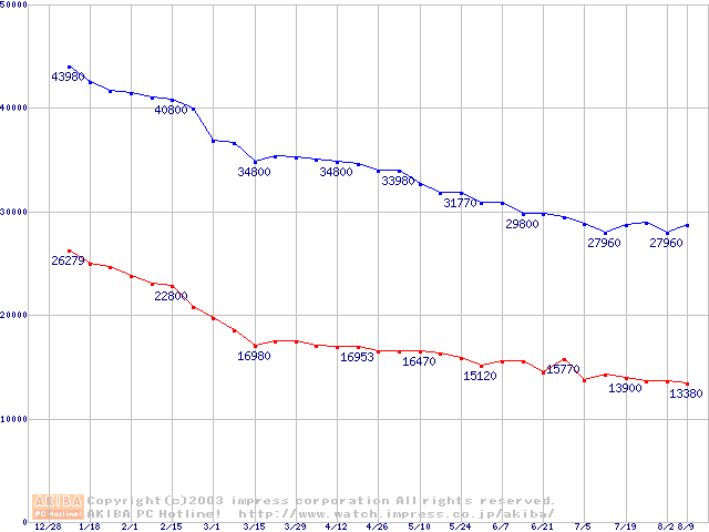 | [↑前グラフ]: | MaXLine II (5400rpm,UltraATA/133,2MB,80GB/Platter,BB)の最安値推移 |
