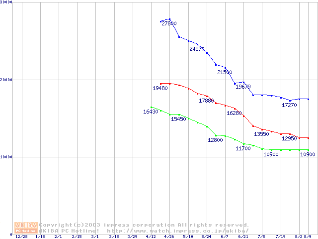 | [↑前グラフ]: | Fireball 3 (5400rpm,UltraATA/133,2MB,FDB)の最安値推移 |