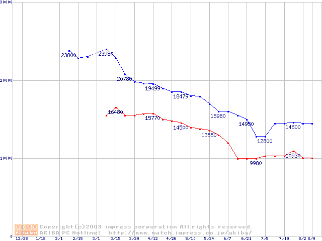 | [↑前グラフ]: | Barracuda 7200.7 (7200rpm,SerialATA,8MB,80GB/Platter,FDB)の最安値推移 |