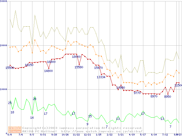 PC2100(DDR266) DDR SDRAM DIMM ECC対応 Registeredタイプの最安値推移