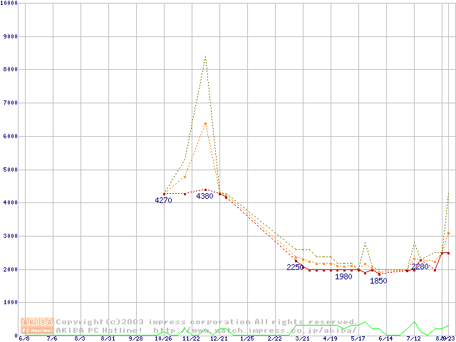 PC2700(DDR333) DDR SDRAM DIMMの最安値推移