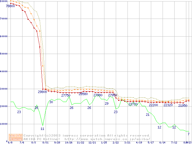 Socket 478 (micro-PGA,FSB 533MHz,L2 512KB,Northwood)の最安値推移