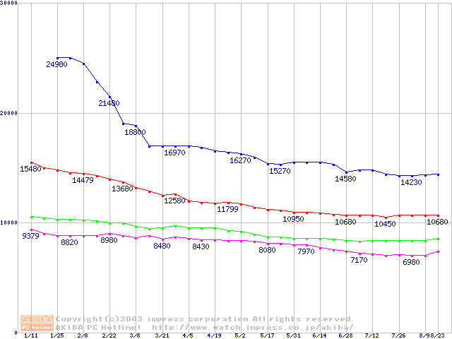 | [↑前グラフ]: | DiamondMax 16 (5400rpm,UltraATA/133,2MB,80GB/Platter,BB)の最安値推移 |