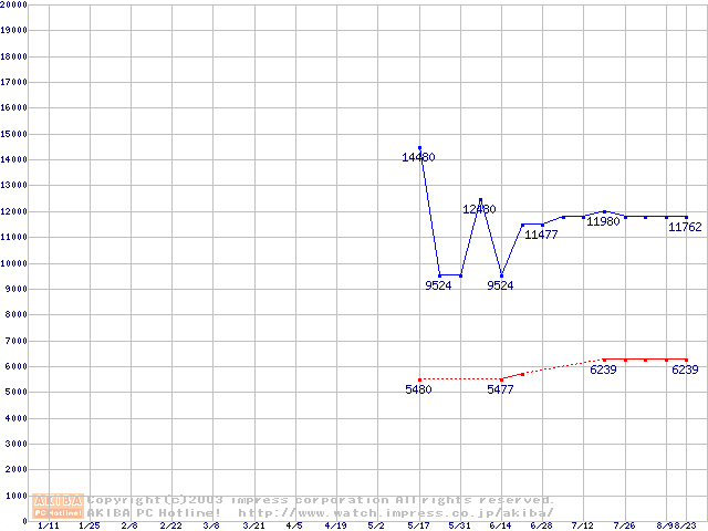 | [↓次グラフ]: | PC3200(DDR400) DDR SDRAM DIMM ECC対応 Registeredタイプの最安値推移 |