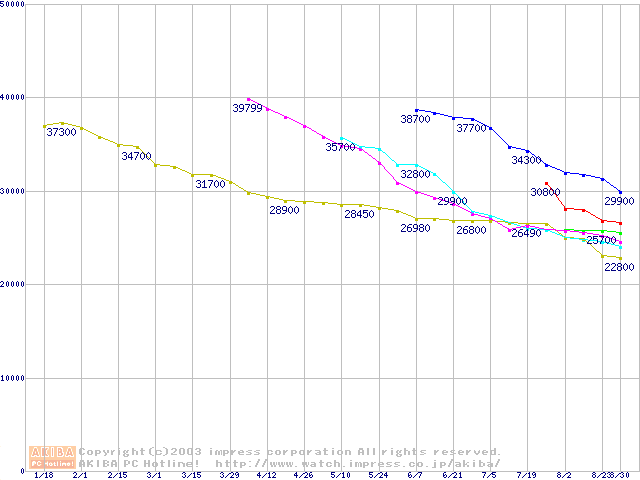 | [↓次グラフ]: | 2.5インチHDD主要製品(最安値3万円以上)の最安値推移 |