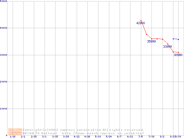 | 2.5インチHDD主要製品(最安値3万円以上)の最安値推移 |