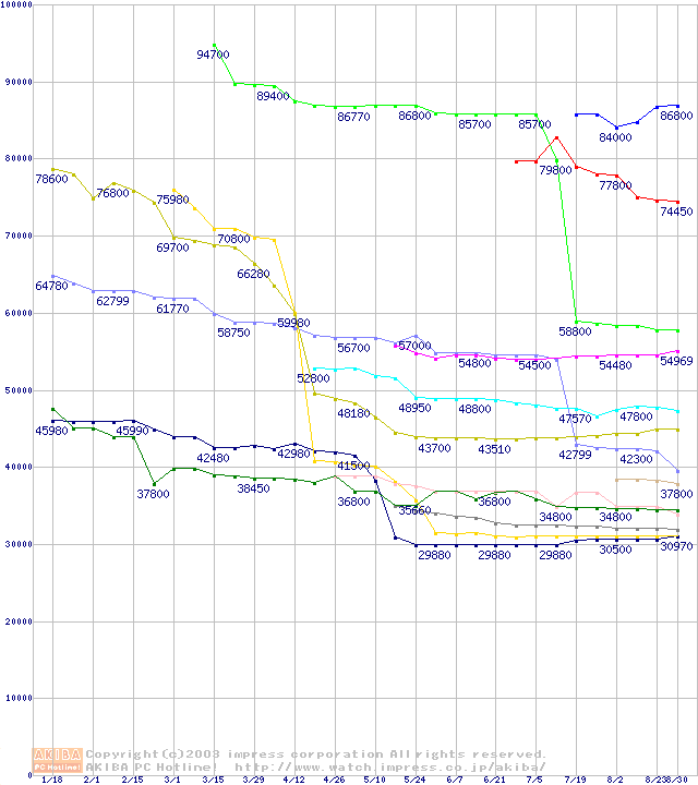 CPU主要製品(最安値3万円以上)の最安値推移
