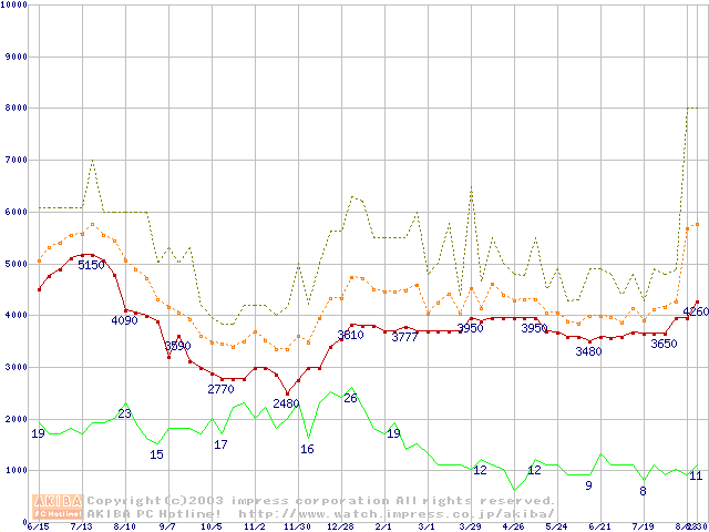 PC133 SDRAM DIMM CasLatency=2の最安値推移