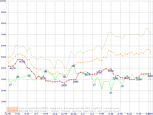 PC100 SDRAM DIMM CasLatency=2の最安値推移