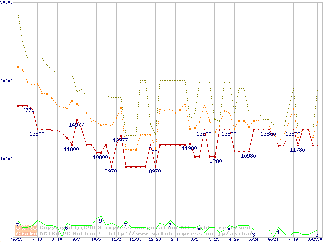 PC133 SDRAM DIMM CasLatency=3 ECC対応 Registeredタイプの最安値推移