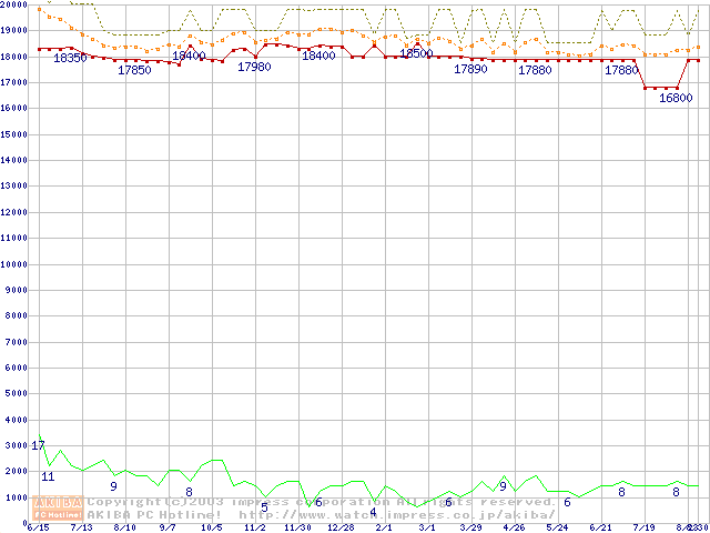Socket 370 (FC-PGA2,FSB 133MHz,L2 512KB,Tualatin)の最安値推移