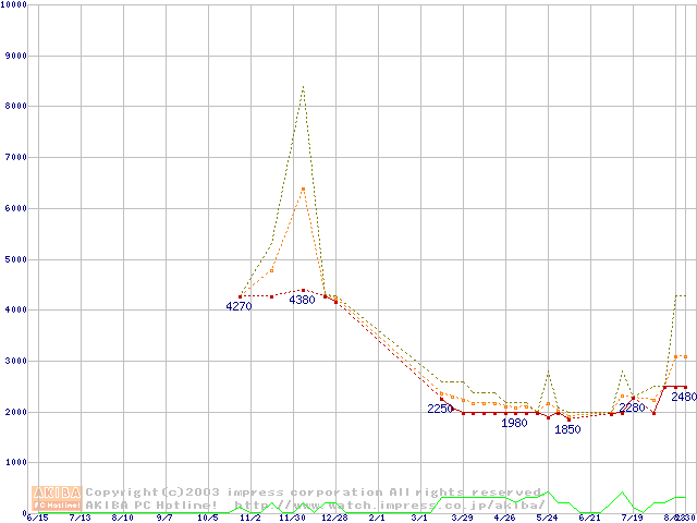 PC2700(DDR333) DDR SDRAM DIMMの最安値推移