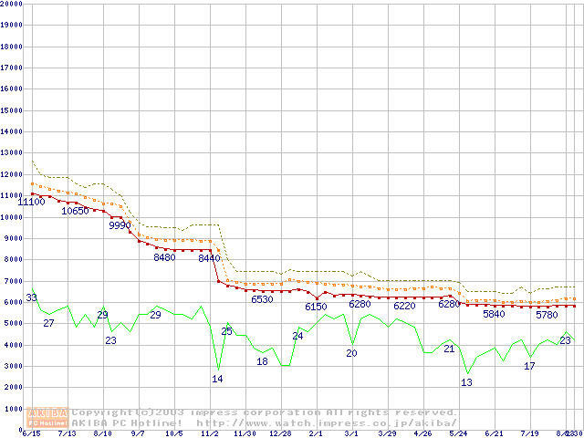 Socket 370 (FC-PGA2,FSB 100MHz,L2 256KB,Tualatin)の最安値推移
