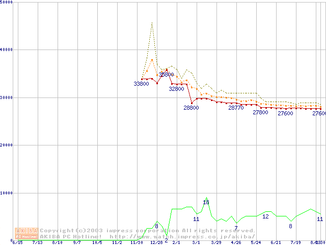 Socket 604 (micro-PGA,FSB 533MHz,L2 512KB,Prestonia)の最安値推移
