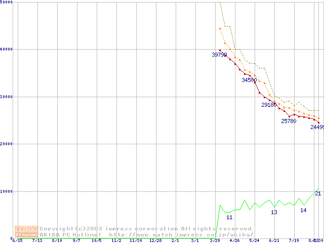 Travelstar 80GN (9.5mm,4200rpm,UltraATA/100,8MB,FDB,40GB/Platter)の最安値推移