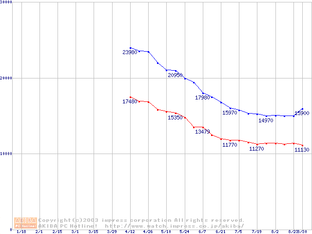 | [↓次グラフ]: | Barracuda 7200.7 (7200rpm,UltraATA/100,2MB,80GB/Platter,FDB)の最安値推移 |