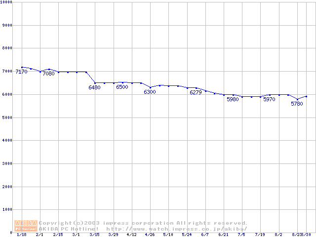 | [↑前グラフ]: | Barracuda 5400.1 (5400rpm,UltraATA/100,2MB,FDB)の最安値推移 |