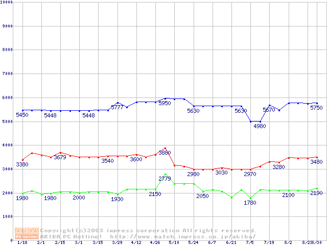 | [↓次グラフ]: | PC133 SDRAM DIMM CasLatency=2の最安値推移 |