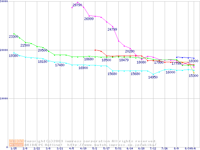 | [↓次グラフ]: | 2.5インチHDD主要製品(最安値2万円~3万円未満)の最安値推移 |