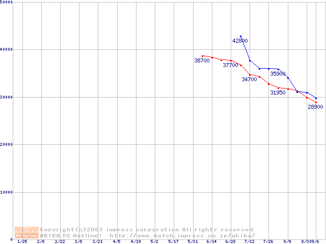 | [↑前グラフ]: | 2.5インチHDD 40GB~50GB未満(9.5mm厚,5400rpm)の最安値推移 |