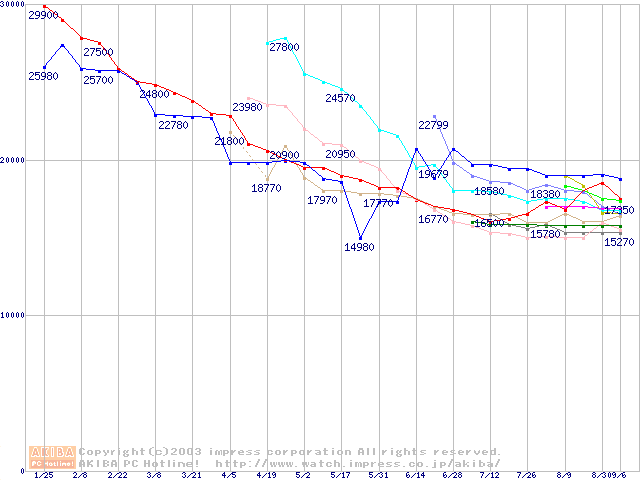 HDD主要製品(最安値1万5千円~2万円未満)の最安値推移