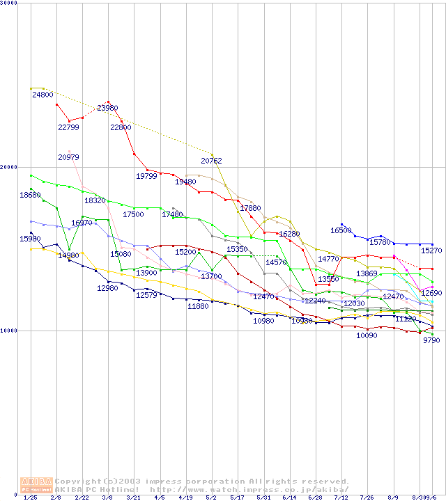 HDD 100~160GB未満(7200rpmクラス)の最安値推移